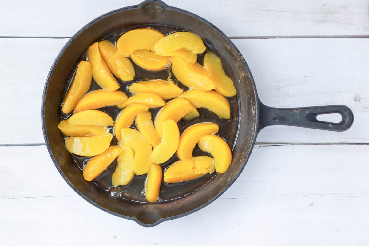 If you're using fresh peaches, slice and place them in the skillet. If using canned peaches, pour them (with any syrup) directly into the skillet.