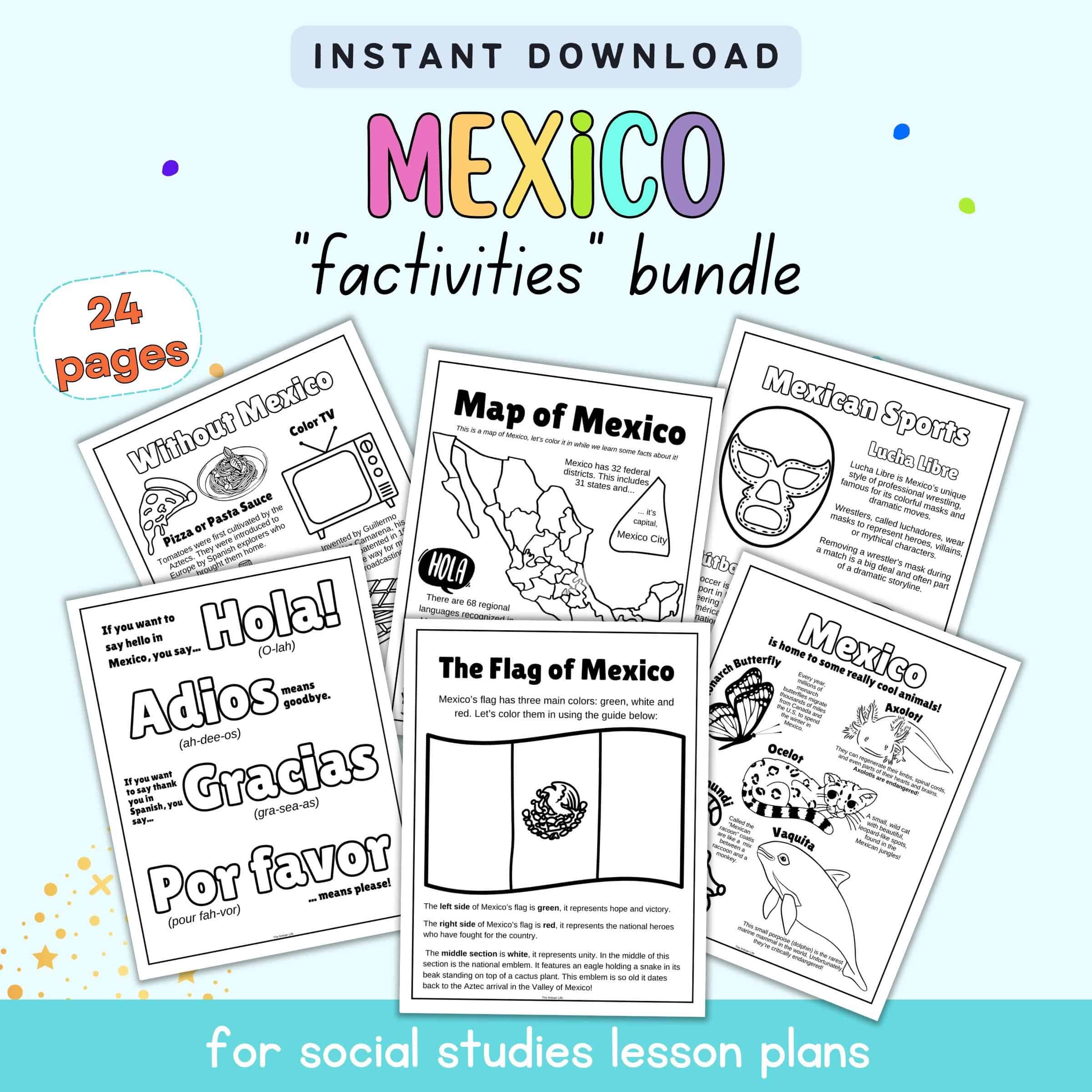This "factivities" bundle includes 20+ budget saving black and white pages with coloring elements and information about Mexican, geography, culture, and language.