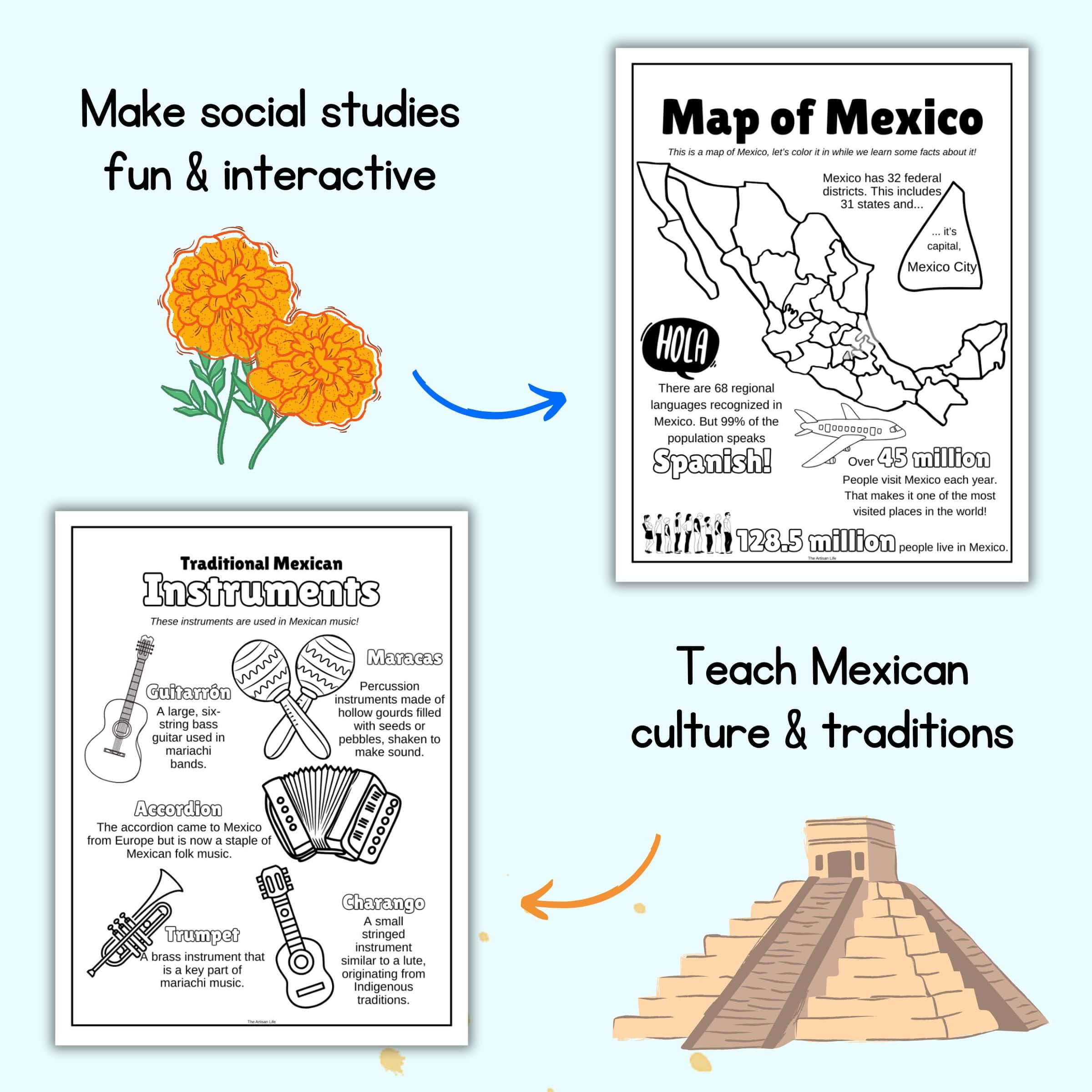 This "factivities" bundle includes 20+ budget saving black and white pages with coloring elements and information about Mexican, geography, culture, and language.