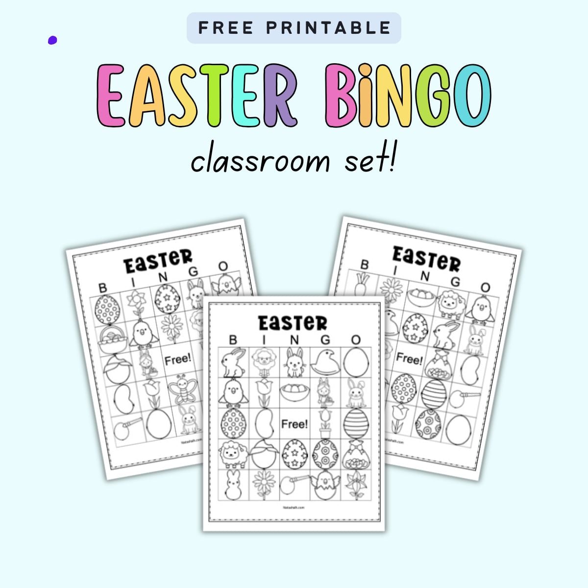 • text "free printable easter bingo classroom set" with a preview of three easter bingo cards in black and white