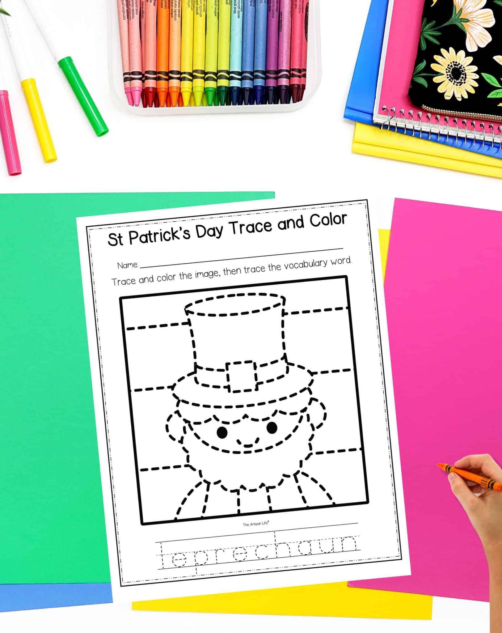 This set of St Patrick's Day trace and color pages features 10 different pictures to trace and color. The pages also have their corresponding words in a dotted font to trace for handwriting practice.