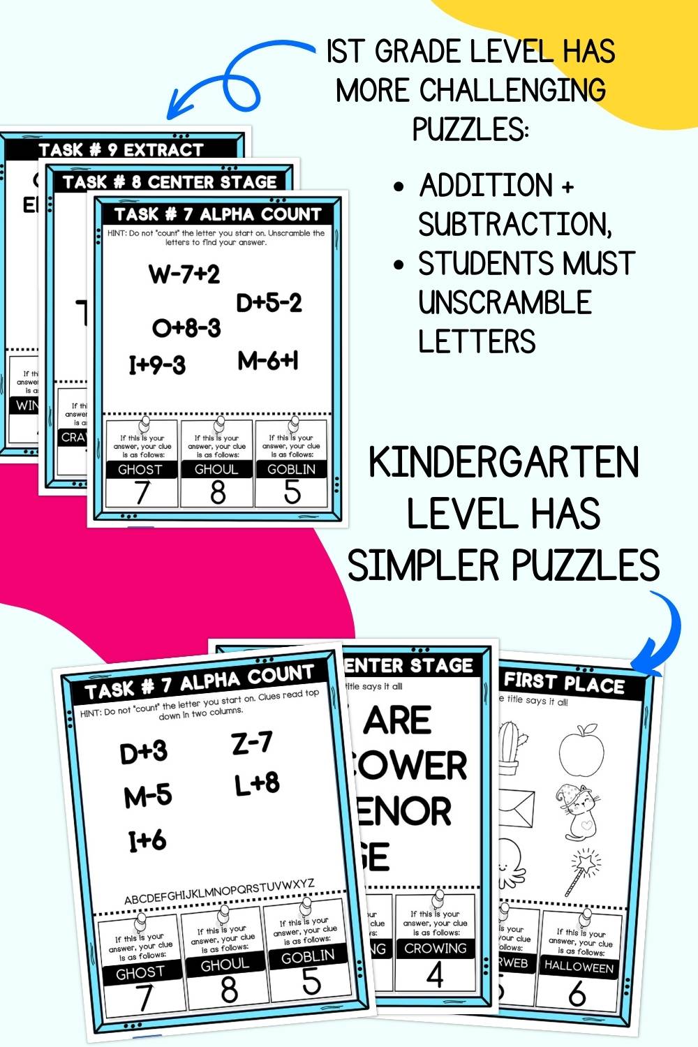 These escape room puzzles are designed for children 5-8. Two different difficulty levels are included so you an differentiate instruction. Both sets have the same answers, so you can mix and match for a customized experience that match’s your students’ needs.